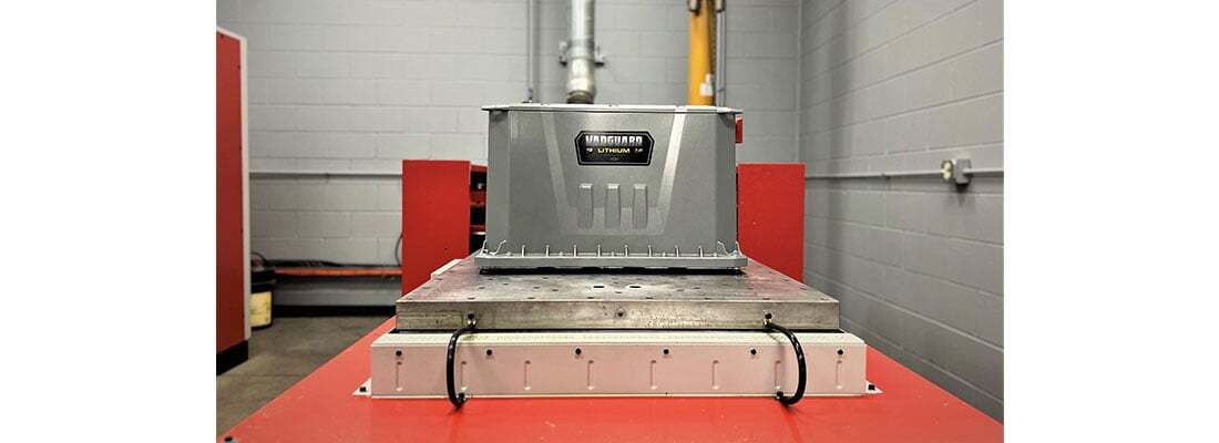 A Vanguard Commercial Battery on a shaker table in Briggs & Stratton’s Noise, Vibration, and Harshness (NVH) Lab located in Wauwatosa, WI.